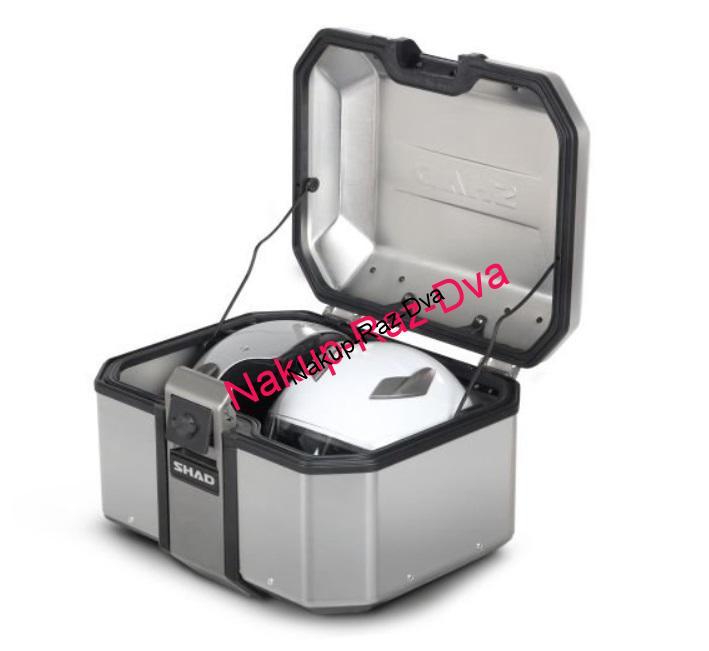 Celohliníkový aerodynamický kufr s vyraženým logem Shad, patentovaný uzamykací systém z nerezové oceli, dvě možnosti uchycení